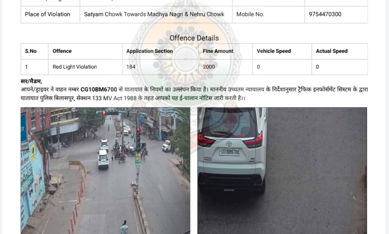 एसपी हो तो ऐसा : पुलिस अधीक्षक के वाहन का हुआ बिलासपुर में ही चालान,वाहन चालक ने किया सिग्नल जंप,ITMS के कैमरे में कैद हुई तस्वीर, मिला नोटिस,पुलिस कप्तान नहीं थे उस वाहन में, फिर भी उन्होंने पटाया चालान