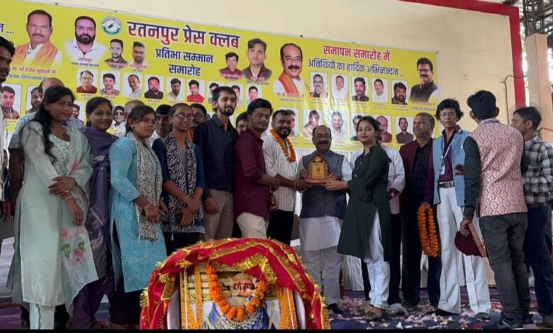 बिलासपुर। राष्ट्रीय हिंदी दिवस 14 सितंबर के अवसर प्रेस क्लब रतनपुर द्वारा प्रतिभा सम्मान समारोह का आयोजन किया गया। इस अवसर पर मुख्य अतिथि के रूप में पहुंचे डिप्टी सीएम अरुण साव और क्षेत्र के विधायक अटल श्रीवास्तव जिन्होंने सबसे पहले माँ महामाया देवी के छाया चित्र पर दीप प्रज्ज्वलित कर मातारानी का आशीर्वाद लेकर क्षेत्र की जनता की सुख समृद्धि की प्रार्थना की। उप मुख्यमंत्री ने रतनपुर प्रेस क्लब को प्रेस क्लब भवन के लिए 15 लाख देने की घोषणा की। कार्यक्रम की अध्यक्षता विधायक अटल श्रीवास्तव ने की। मुख्य अतिथि श्री अरुण साव ने समारोह में समाज मे उत्कृष्ट कार्य कर नगर का गौरव बढ़ाने वालों को श्रीफल,मोमेंटो व माता रानी की चुनरी भेंट कर सम्मानित किया गया। वंही सांस्कृतिक कार्यक्रम में विजेताओं को क्षेत्रीय विधायक अटल श्रीवास्तव के हांथो प्रथम पुरस्कार 11001 रुपये,द्वितीय पुरस्कार 7001व तृतीय पुरस्कार 5001 रुपये की नगद पुरस्कार राशि प्रदान किया गया। प्रेस क्लब रतनपुर द्वारा लगातार चौथे वर्ष प्रतिभा सम्मान समारोह के अवसर पर डिप्टी सी एम ने सबसे पहले रतनपुर प्रेस क्लब को बधाई देते हुए कहा कि प्रेस क्लब द्वारा नगर की की प्रतिभाओं का सम्मान सामाजिक सरोकार व जागरूकता को प्रदर्शित करता है। इन्होंने समाज मे एक अनुकरणीय उदाहरण पेश किया है। इसके अलावा वहां उपस्थित प्रतिभावान बच्चों को भी अनेको उदाहरण देकर उनका हौसला बढ़ाया।