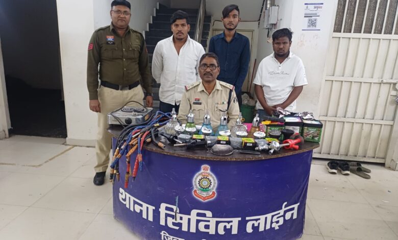 सिविल लाइन पुलिस की बड़ी कार्रवाई : अवैध हुक्का बार बंद, तीन आरोपी गिरफ्तार,छापेमारी में हुक्का सामग्री, मोबाइल और नकदी जब्त