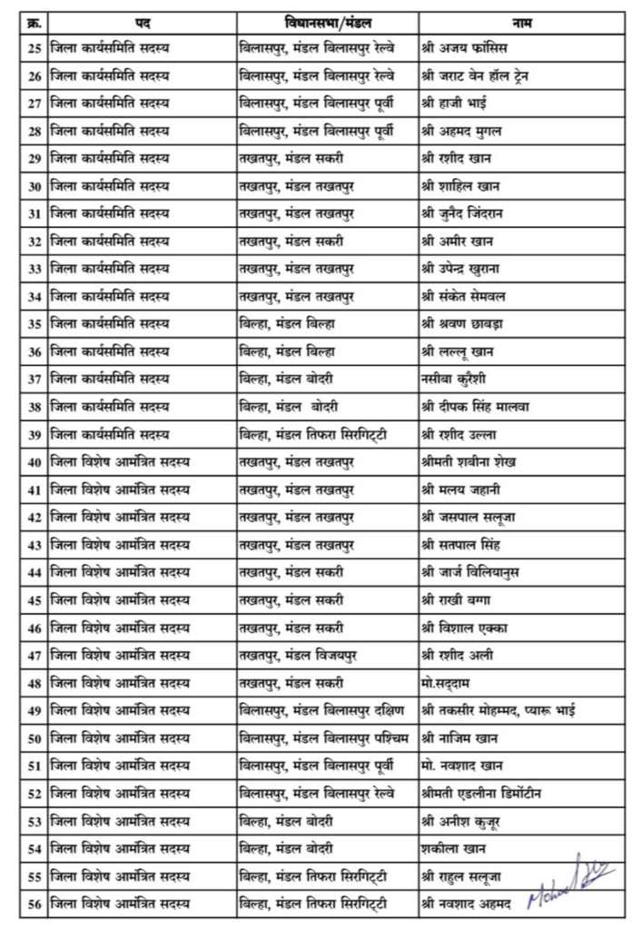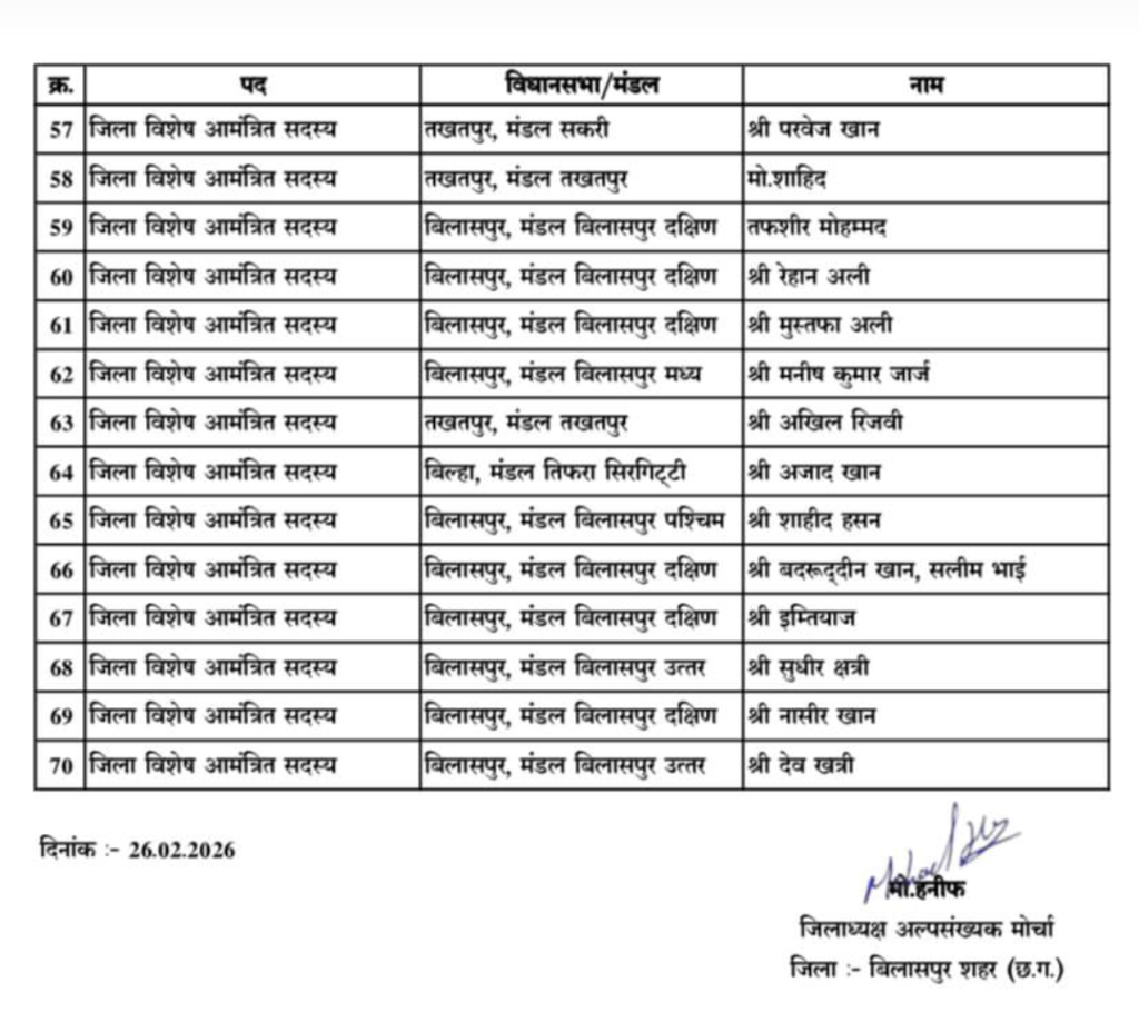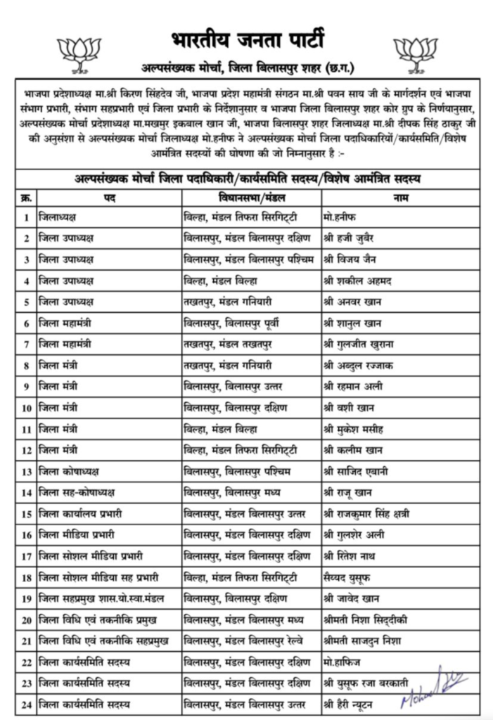 बिलासपुर। भारतीय जनता पार्टी के संगठनात्मक निर्णय के तहत अल्पसंख्यक मोर्चा में जिला स्तर पर नई जिम्मेदारियों की घोषणा की गई है। प्रदेश नेतृत्व के मार्गदर्शन में भाजपा बिलासपुर शहर जिला कोर ग्रुप के निर्णय अनुसार अल्पसंख्यक मोर्चा के जिला पदाधिकारियों, कार्यसमिति व विशेष आमंत्रित सदस्यों की सूची जारी की गई।
