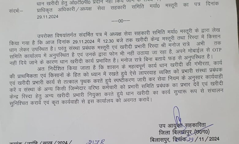 समिति प्रबन्धक को धान खरीदी में लापरवाही करना पड़ा भारी, उपायुक्त द्वारा हटाये गए समिति प्रबन्धक